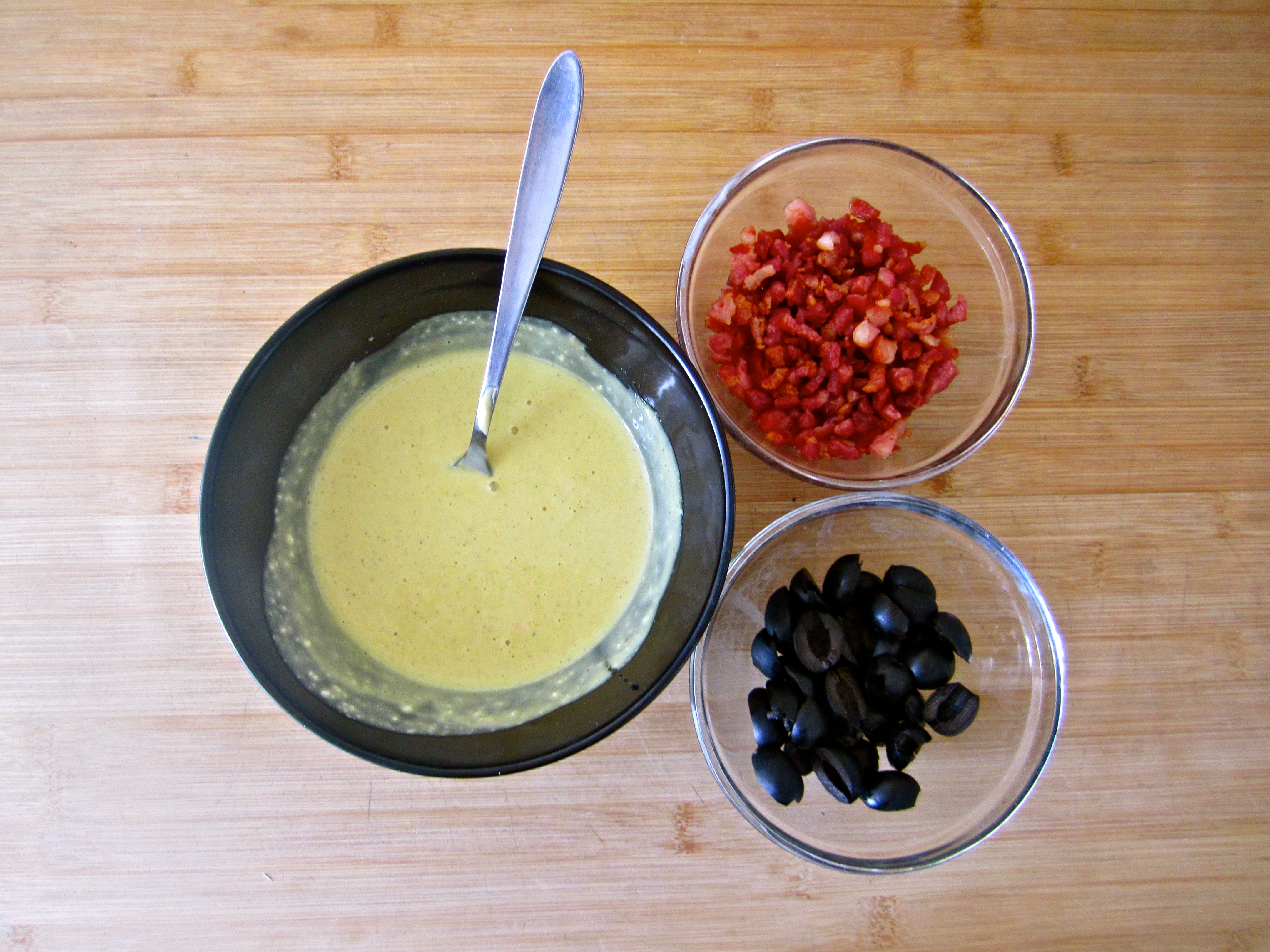 PREP THE BACON, OLIVES & YOLK SAUCE: While the eggs are boiling and cooling off, cook your bacon and slice up your olives. Set them aside in separate dishes as you’ll use these ingredients to garnish later on. In a medium sized bowl, add the mayonnaise, mustard, honey, olive oil, lemon juice, salt, pepper and a tablespoon of parmesan cheese. (For most of these ingredients I said 2-3 tablespoons or 2-3 teaspoons: I’d start with 2 and as necessary add more once the yolk has been added to the mixture. That way you can achieve your desired texture & taste).